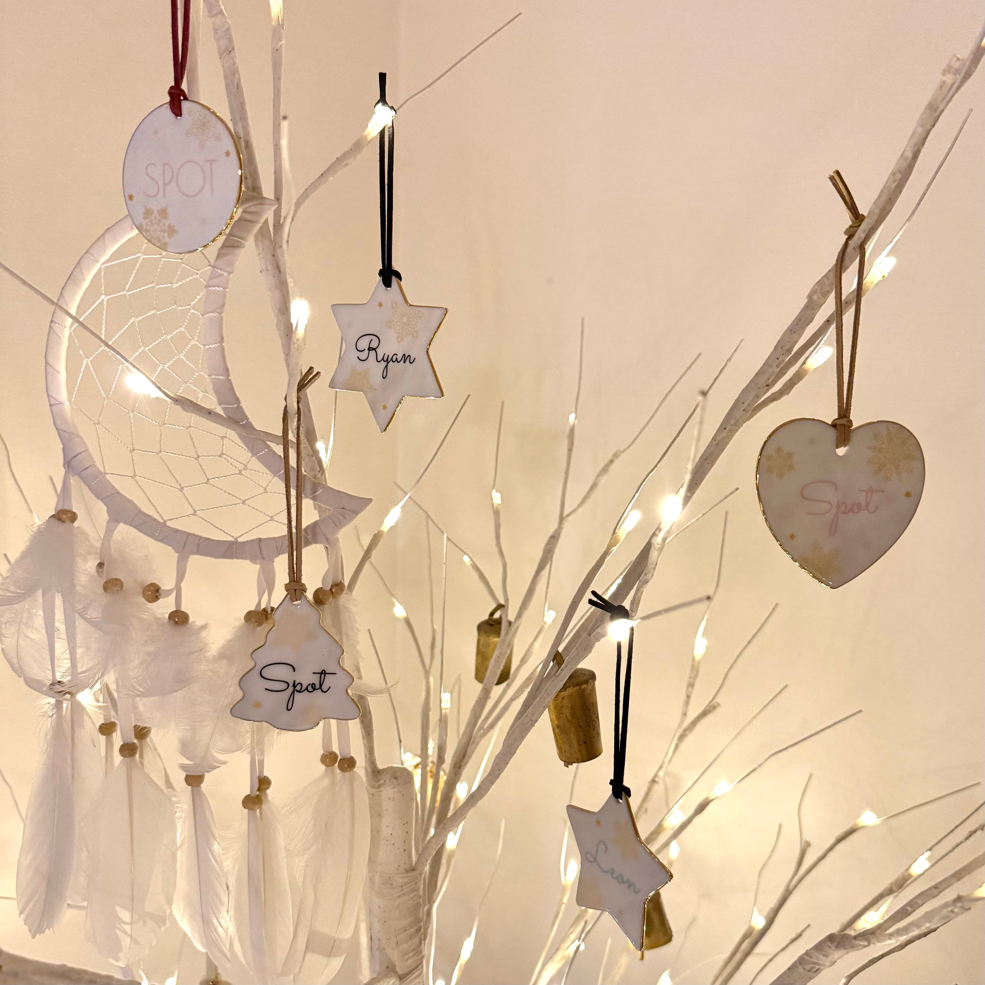 オーナメントの形・裏面モチーフ・名前の色・フォント・スエードコードの色を自由に選べるカスタム仕様で、あなた好みの一枚に仕上がります。